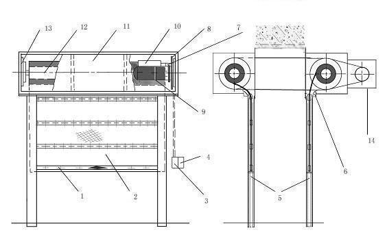 (1)座板; (2)簾板; (3)按鈕開關(guān); (4)手動速放裝置; (5)導(dǎo)軌; (6)門楣; (7)限位器; (8)鏈輪; (9)卷門機(jī); (10)控制箱; (11)箱體; (12)卷軸; (13)支座 (14)電機(jī)